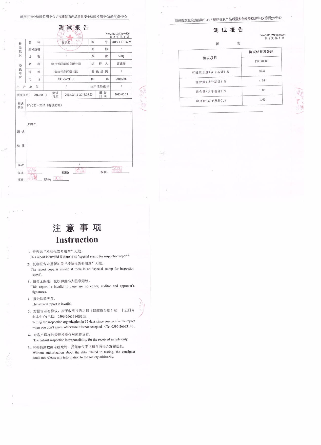 漳州市農(nóng)業(yè)檢驗監(jiān)測中心/福建省農(nóng)產(chǎn)品質(zhì)量安全檢驗檢測中心(漳州)分中心測試報告--有機肥檢測